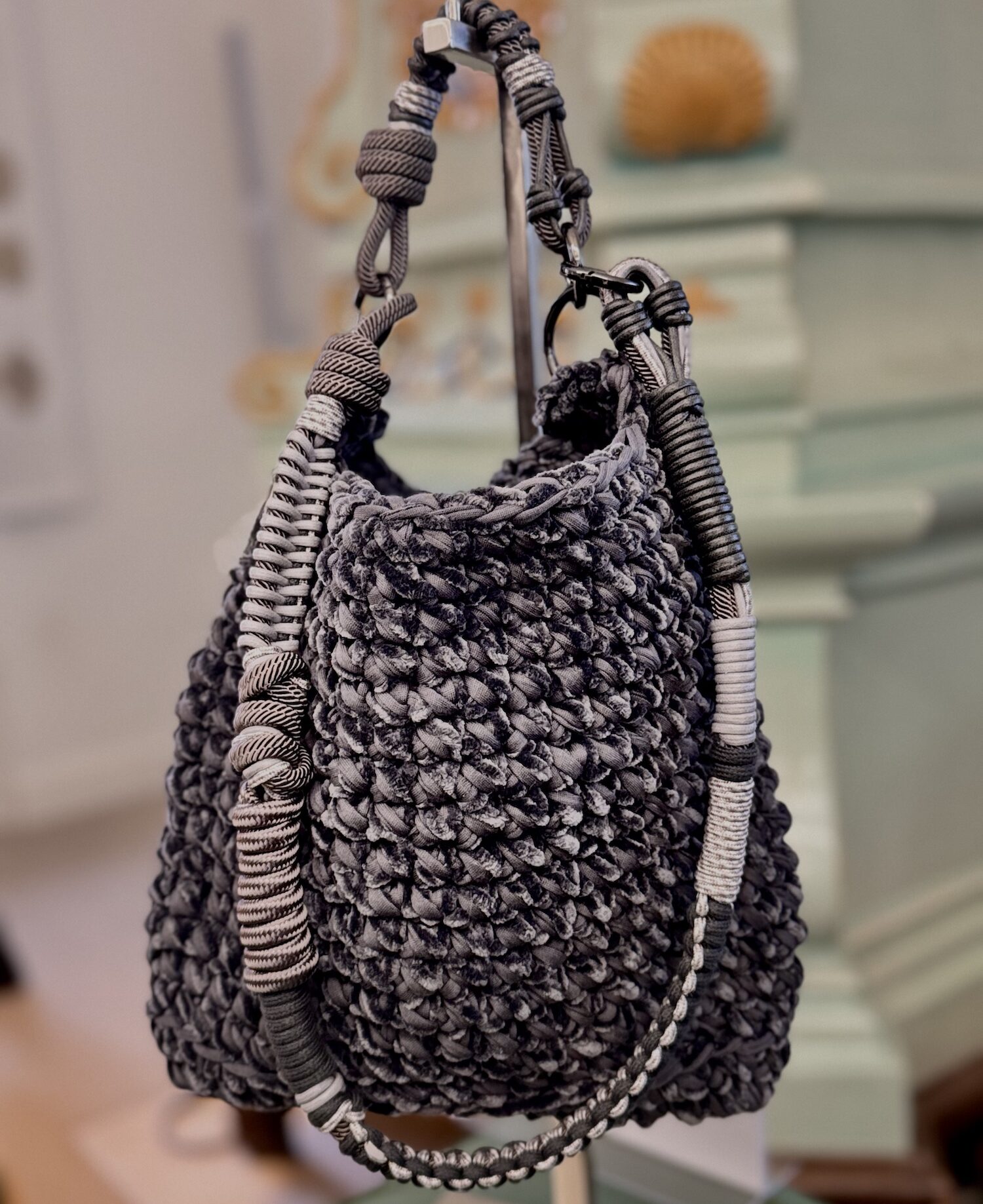 mit einem geflochtenen Taschengurt in verschiedenen grau Tönen  aus italienischen Nylon- und Baumwollbändern von @tiefenbacherlehmann