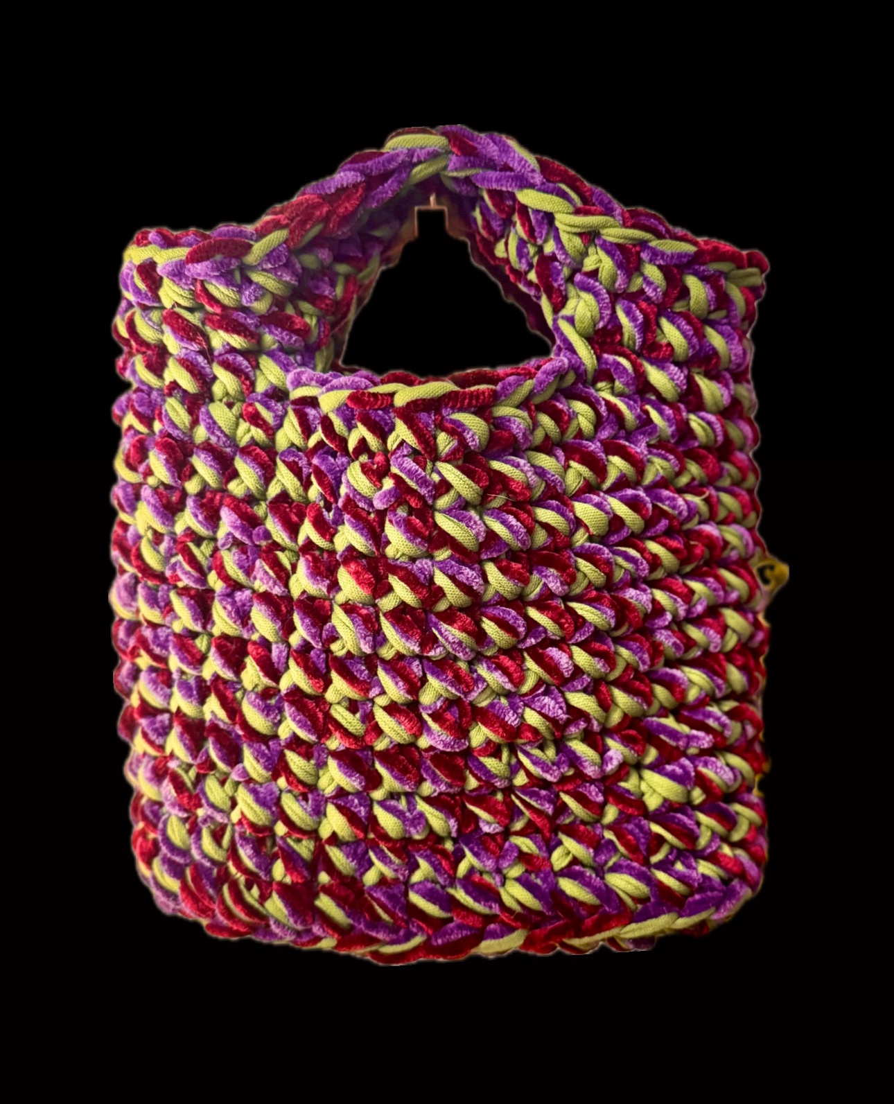 Die Tasche ist mit drei Fäden gehäkelt, der Samt ist 100% Polyester, das Baumwollgarn ist aus 90% Baumwolle und 10% gemischter Faser.